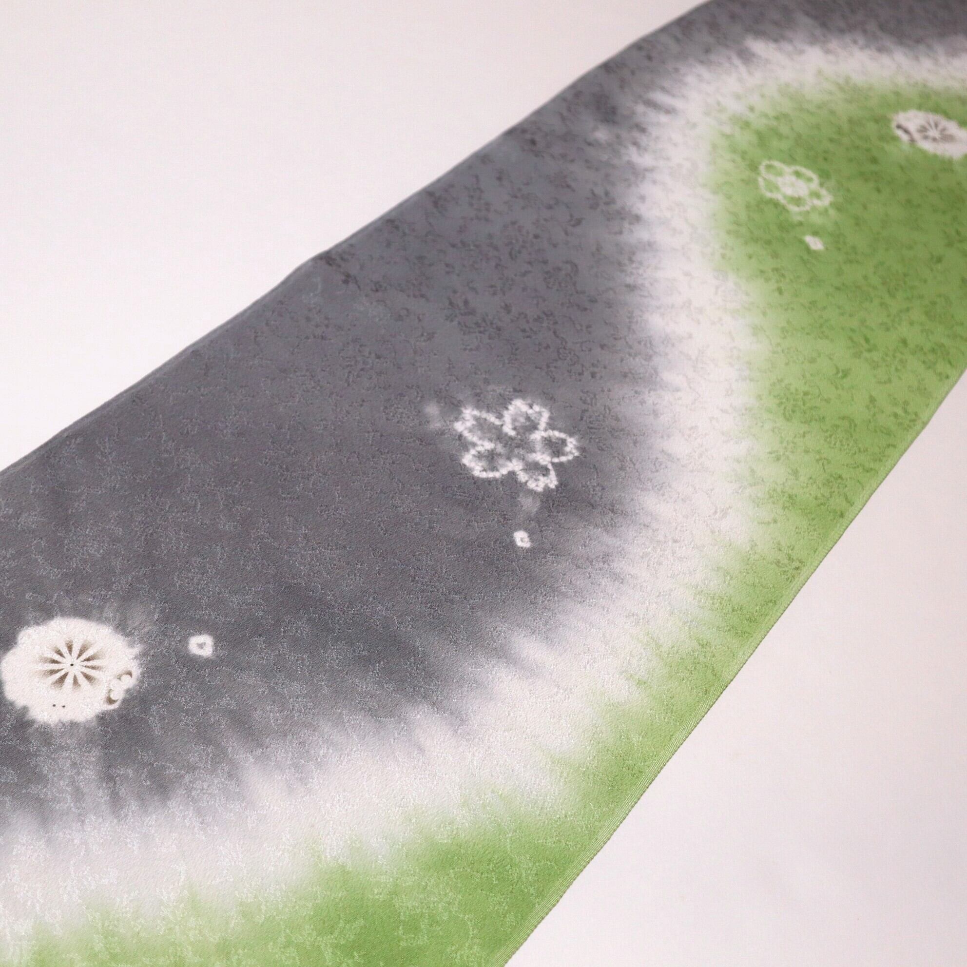 紗綾形に小花唐草模様の丹後ちりめんの生地に、若草色・銀ねずを染めました。